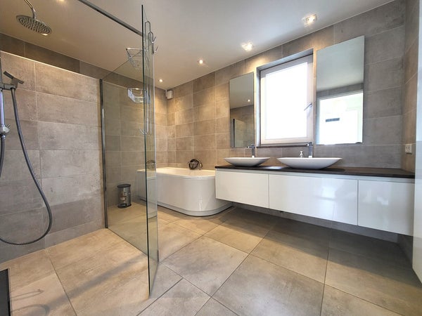 Baño de lujo (10m²) con bañera, mueble lavabo doble, ducha de masajes / lluvia y toallero de diseño.