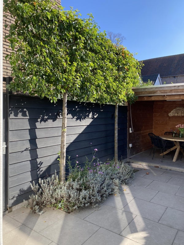 - Jardín trasero soleado orientado al sur con toldo y almacenamiento