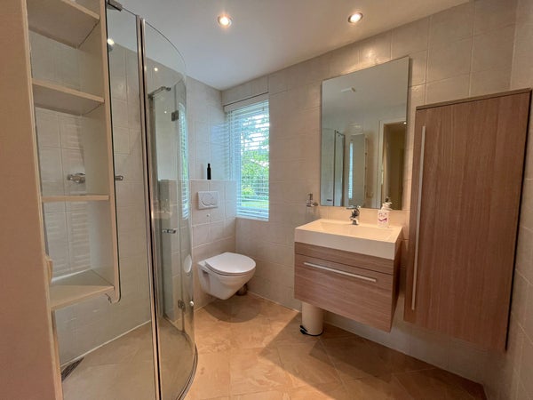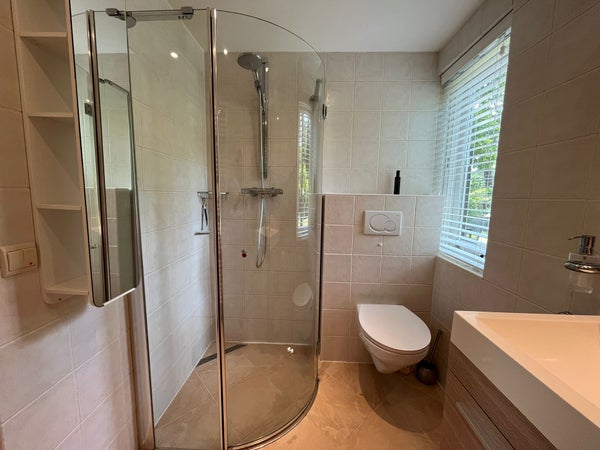 El baño moderno está lujosamente decorado y equipado con una elegante cabina de ducha, un inodoro suspendido y un bonito mueble de baño con espejo. En toda la propiedad se ha optado por una decoración fresca y cuidada y un acabado adecuado.