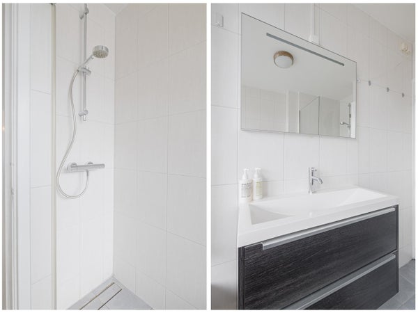 Baño equipado con ducha a ras de suelo, bañera, lavabo y 2º baño.