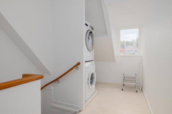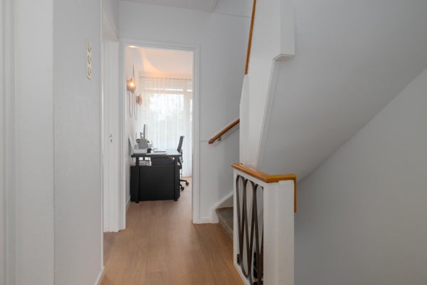Escalera al 2º piso, pasillo con instalación de lavadora y secadora, amplia 3ª habitación en la parte delantera y amplia 4ª habitación en la parte trasera. Además, hay una pequeña habitación que se puede utilizar como oficina o para colgar la ropa (lavandería).