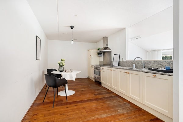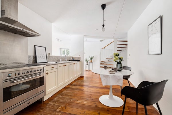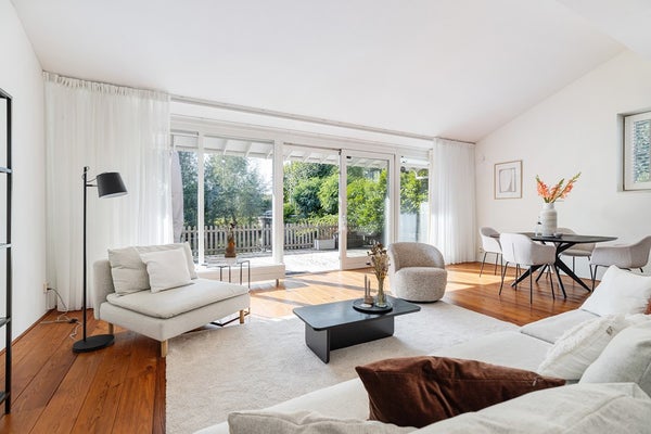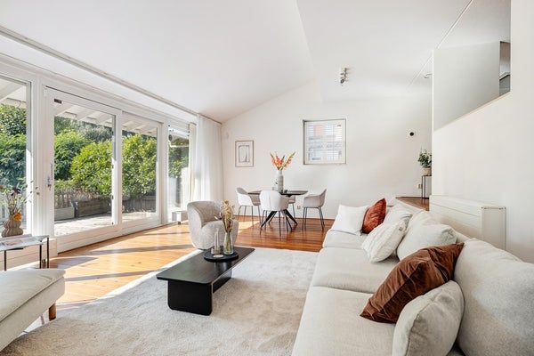 La sala de estar ligeramente hundida se siente maravillosamente natural y abierta gracias a sus techos altos, grandes ventanas y una ventana lateral adicional. El cómodo sofá en esquina y los sillones crean un cálido e acogedor espacio vital (se colocará un sofá en esquina diferente en la sala de estar al que se muestra en las fotos). Las puertas corredizas llevan a la gran y soleada terraza sobre el agua, completa con un área de comedor exterior.