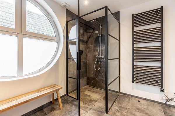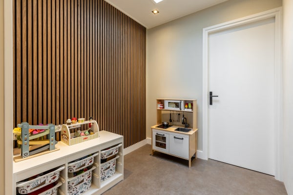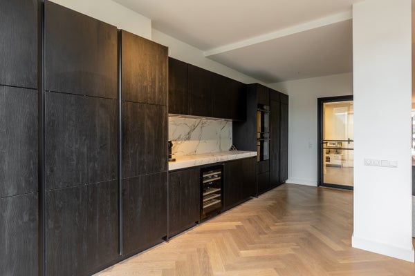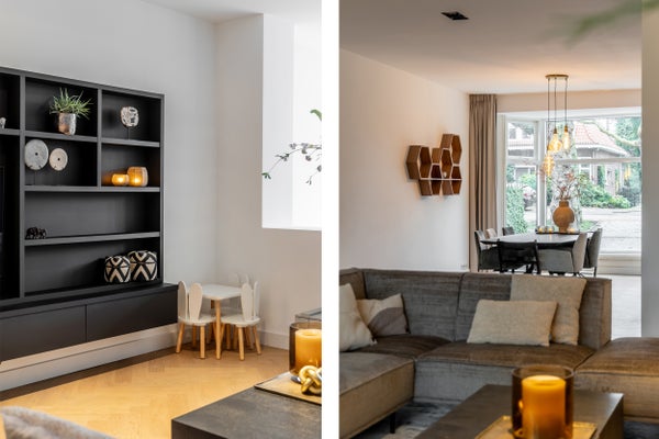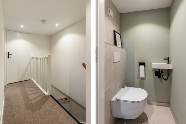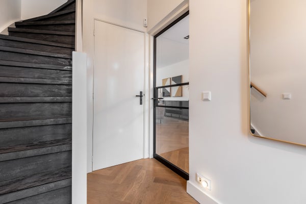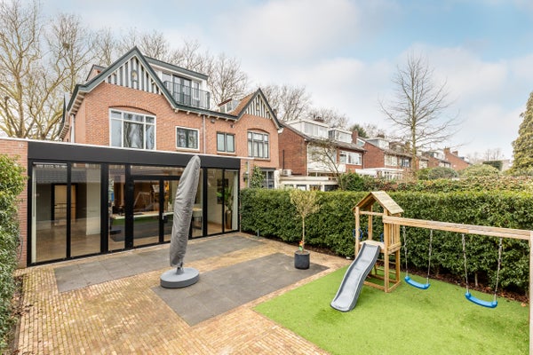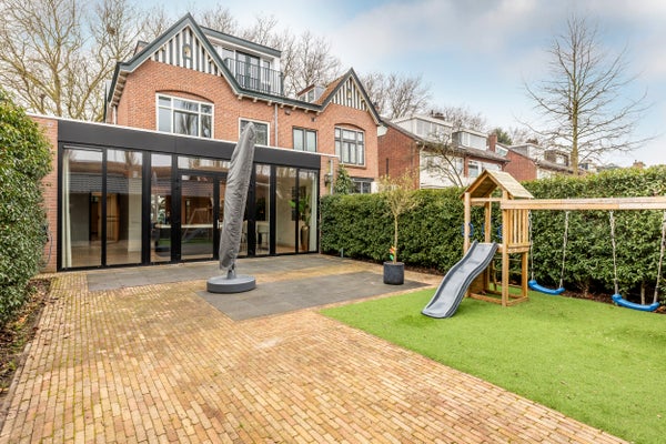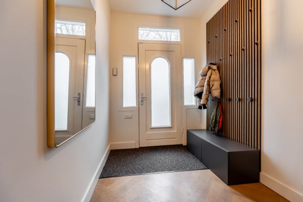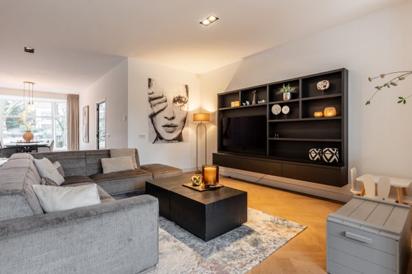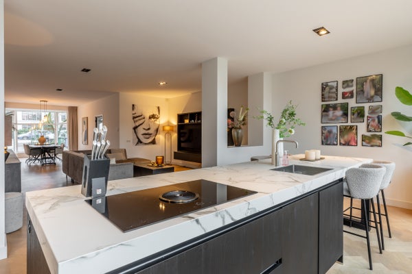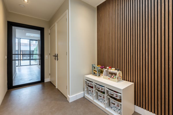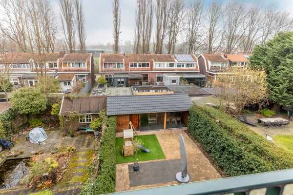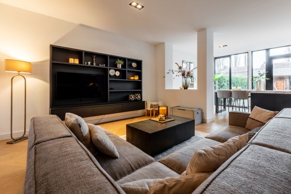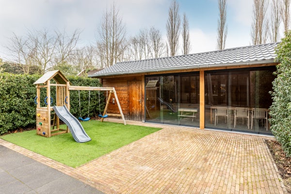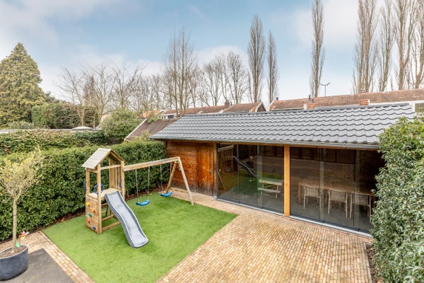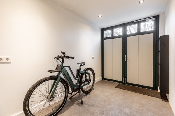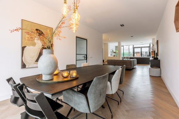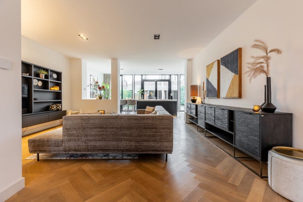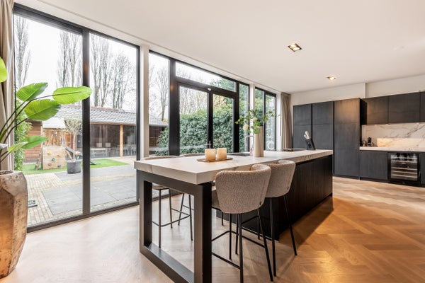 Amplio vestíbulo con aseo. La amplia sala de estar es muy luminosa y cuenta en la parte trasera con una impresionante ampliación donde se ha realizado la lujosa cocina. La cocina está equipada con una gran isla de cocción y lavado con barra de bar incorporada y está equipada con electrodomésticos de alta gama, incluidos un Quooker, lavavajillas, placa de inducción con extracción integrada, bodega, horno con función de vapor y horno separado. A través de puertas corredizas puedes acceder al jardín trasero. Desde la cocina se accede a la sala de juegos, que anteriormente se usaba como oficina. También hay una lavadora, secadora y caldera. Junto a este espacio hay un área de almacenamiento interior con espacio para bicicletas.