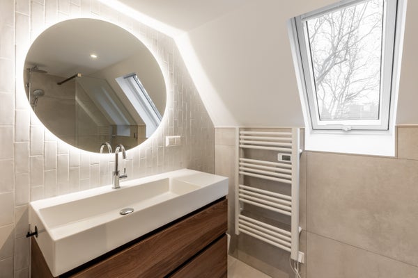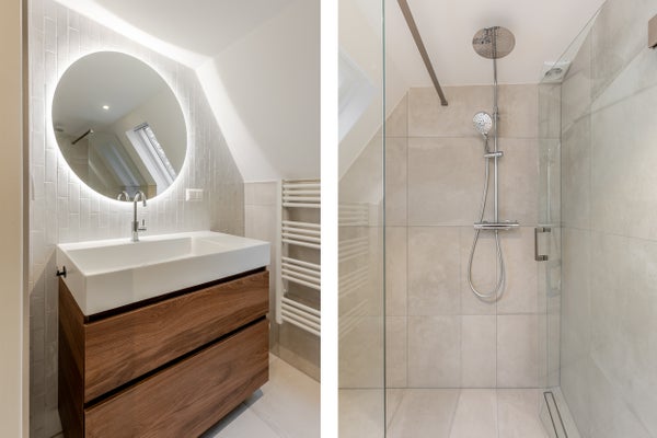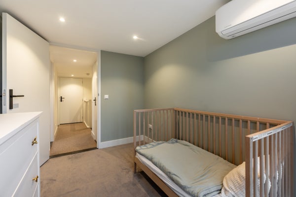 Distribuidor con acceso a tres dormitorios y un baño. El amplio dormitorio principal al fondo cuenta con un gran vestidor y aire acondicionado. En la parte delantera hay dos dormitorios completos, uno de los cuales está actualmente configurado como oficina. El moderno baño está equipado con bañera, ducha a ras de suelo y un mueble de lavabo doble. Además, en este piso hay un aseo separado.