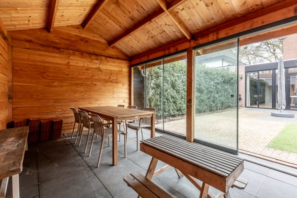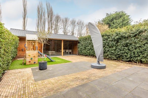 Amplio jardín delantero con espacio para estacionar varios automóviles en la propiedad. El soleado jardín trasero está bien cuidado y ofrece una combinación agradable de espacio, privacidad y comodidad. Justo al lado de la casa hay una amplia terraza pavimentada, ideal para una gran mesa de comedor o un área de descanso. El espacioso dosel de madera con paredes de vidrio deslizantes permite disfrutar de la vida al aire libre prácticamente todo el año. Hay mucho espacio para jugar para los niños.