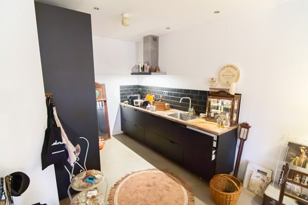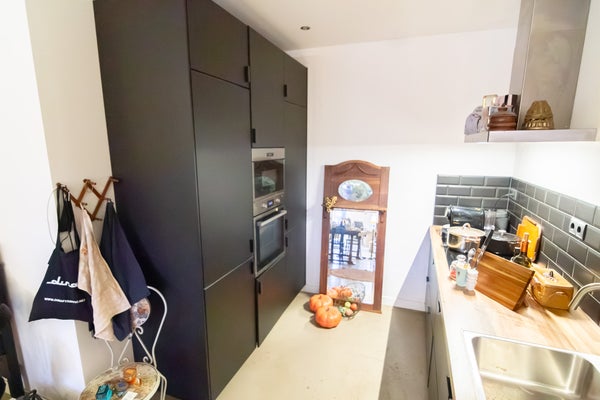 La cocina está elegantemente terminada con azulejos de metro oscuros.