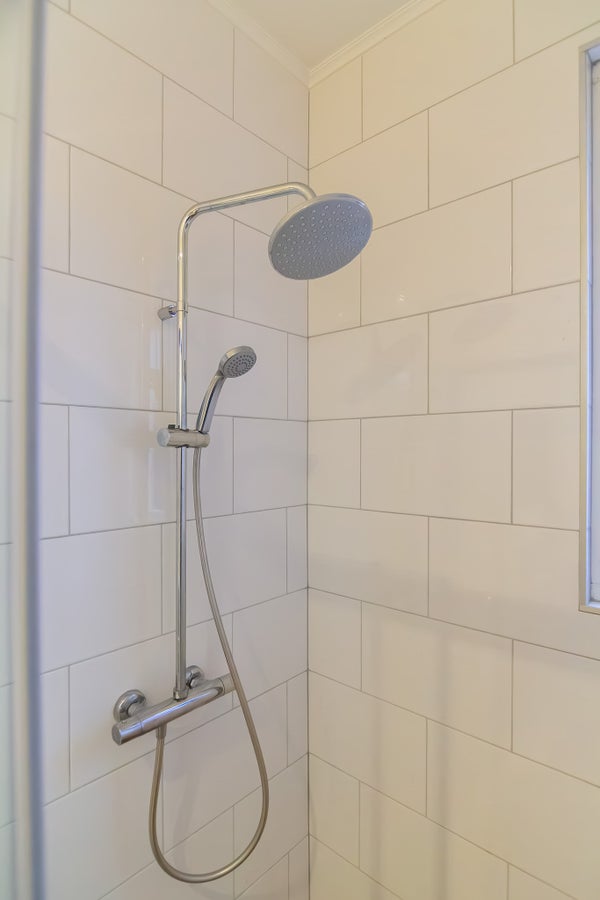 Baño: completamente azulejado con azulejos de pared blancos y suelo de baldosas con efecto madera. Equipado con una amplia ducha a ras de suelo con ducha de lluvia y ducha de mano agradables, y un mueble lavabo moderno con cajones.