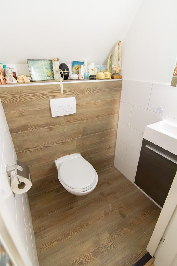 Aseo: aseo separado del mismo estilo, con inodoro suspendido, lavabo y pared trasera de aspecto de madera.