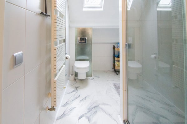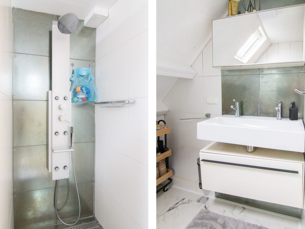 El baño está equipado con una ducha a ras de suelo, lavabo y aseo.