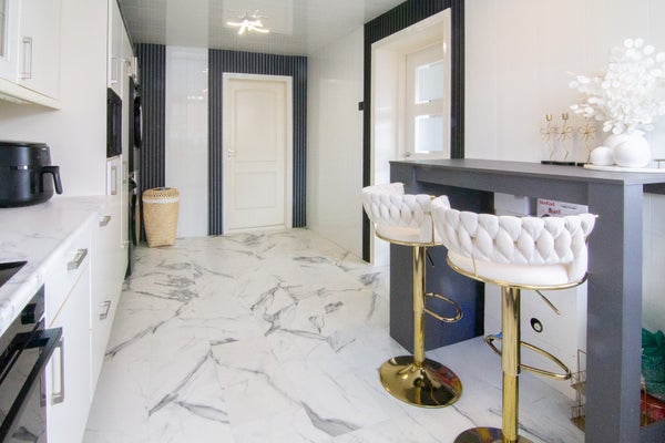La cocina está cerrada y equipada con todas las comodidades: lavavajillas, placa de cocina con extractor, horno, microondas, nevera, congelador y mucho espacio de almacenamiento. Además, hay una instalación para la lavadora y el secador.