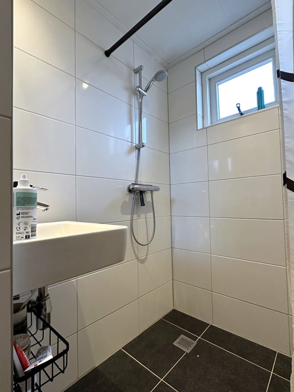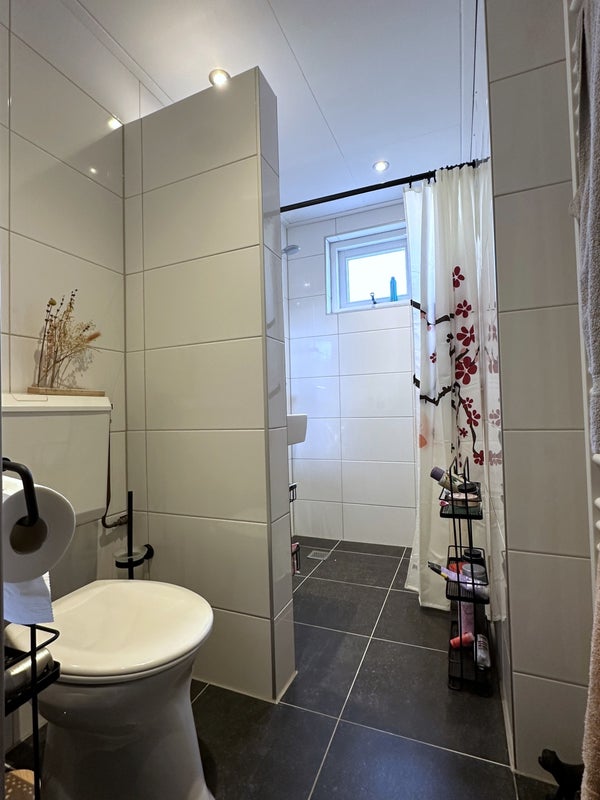 El baño está completamente equipado con un inodoro suspendido, lavabo, ducha a ras de suelo y un radiador de diseño.
