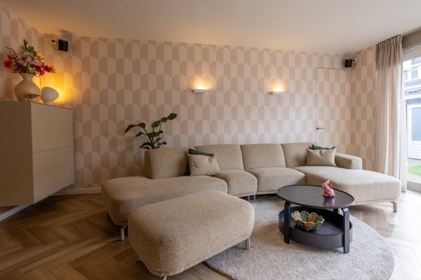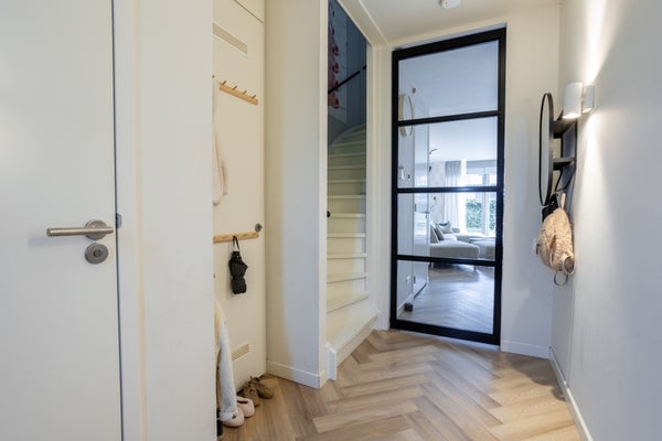 En la planta baja encontrará una acogedora sala de estar con mucha luz natural, un acogedor área de comedor y una moderna cocina en esquina equipada con todas las comodidades. Además, hay una agradable oficina y un garaje para bicicletas y almacenamiento. Desde la sala de estar, se accede al hermoso jardín con un techo, perfecto para relajarse.