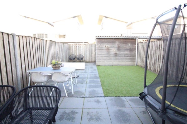 El jardín trasero cuenta con un cobertizo de madera y una entrada trasera privada.