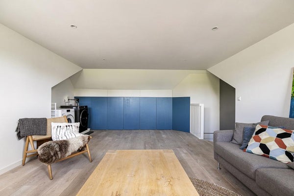 Distribuidor, dormitorio equipado con ventana de buhardilla en la parte trasera y lavadora.