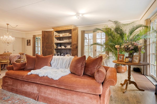 Entrada a través de un amplio y acogedor vestíbulo, con acceso a un baño para invitados, las escaleras al primer piso y el sótano (18 m²). Las puertas de vidrio doble se abren en una amplia sala de estar con chimenea y área de comedor (49 m²). Grandes ventanales y cuatro puertas de vidrio doble conducen al encantador y romántico jardín (1,500 m²), llenando la sala de estar y el comedor de luz natural y ofreciendo bellas vistas de los magníficos alrededores bien cuidados.