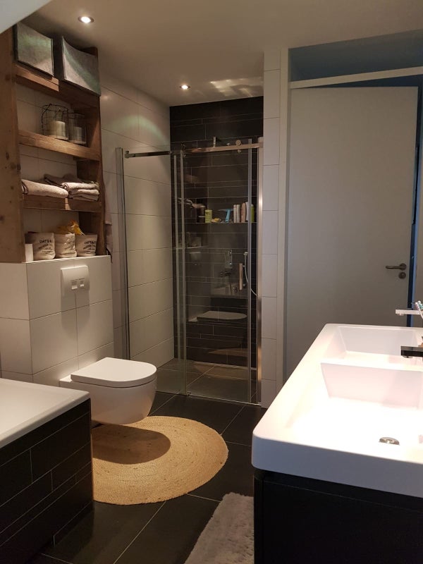 En total, hay tres dormitorios distribuidos en los pisos. El baño está lujosamente decorado y equipado con una bañera, una amplia ducha a ras de suelo, lavabo doble y calefacción por suelo radiante.