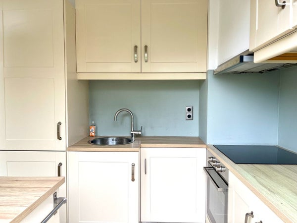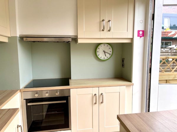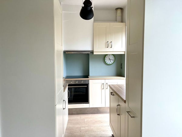 La cocina tiene un refrigerador empotrado, horno, placa de inducción, lavavajillas y una buena cantidad de estanterías/almacenamiento (el horno y el lavavajillas se actualizarán).