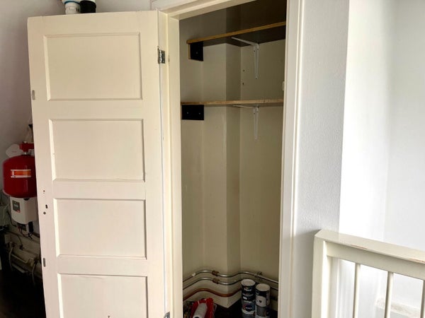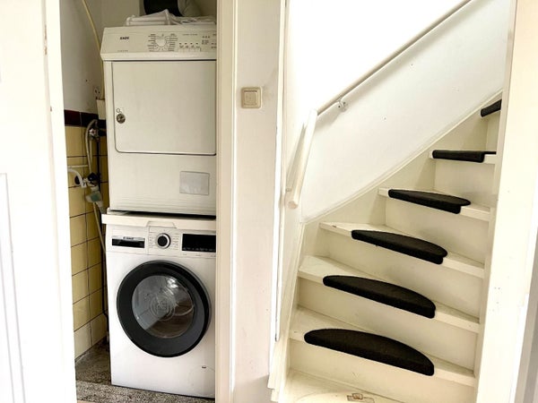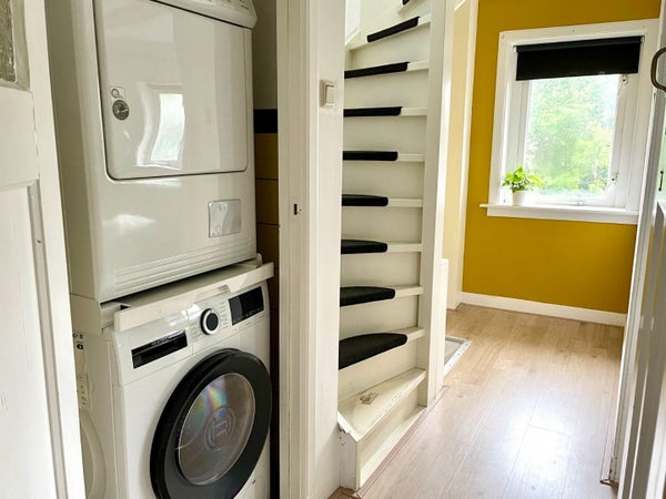 El primer piso también incluye un armario empotrado en el pasillo y un rincón de lavandería con lavadora y secadora. La lavadora es nueva y está alquilada. Es posible que el inquilino lleve su propia lavadora. En ese caso, se puede rescindir el contrato de alquiler de la lavadora y esta puede ser devuelta a la empresa de alquiler (Cool Blue).