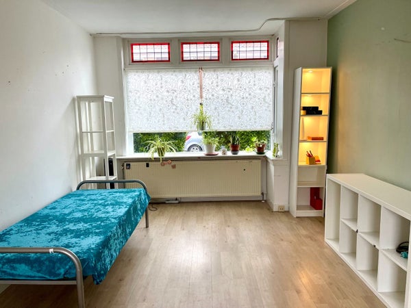 La puerta de entrada conduce a un pasillo estrecho con un perchero, un gran espejo y un (pequeño) baño. Al final del pasillo se encuentran las escaleras que conducen al siguiente piso y la entrada a la sala de estar. La sala de estar es espaciosa y luminosa con dos grandes ventanas, una hacia la calle (mucha luz de la mañana) y otra hacia el jardín trasero. Incluye una cocina compacta pero bien equipada que da al jardín trasero.
