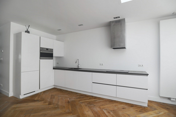 La cucina moderna è completamente attrezzata con vari elettrodomestici da incasso, rendendola una cucina da sogno per ogni cuoco di casa. Il piano terra è rifinito con un elegante pavimento in legno a spina di pesce, caldo ma moderno.