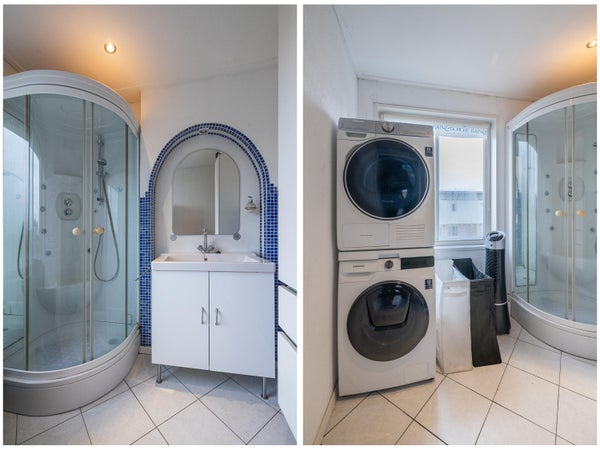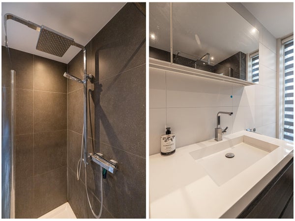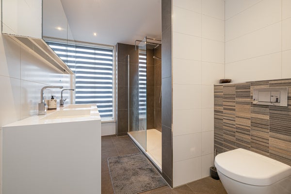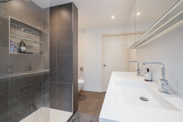 Il lussuoso bagno di 7 m² è completamente piastrellato e splendidamente rifinito in calde tonalità di marrone e bianco. Il bagno è dotato di un lavabo doppio, armadi a muro, una doccia walk-in, un WC e una grande finestra che fornisce molta luce naturale e buona ventilazione.