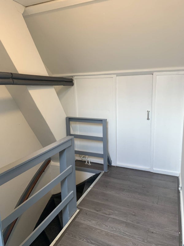 Disimpegno con pavimento in laminato, scala fissa che porta al 2° piano. Accesso a 2 camere da letto e a un bagno separato.