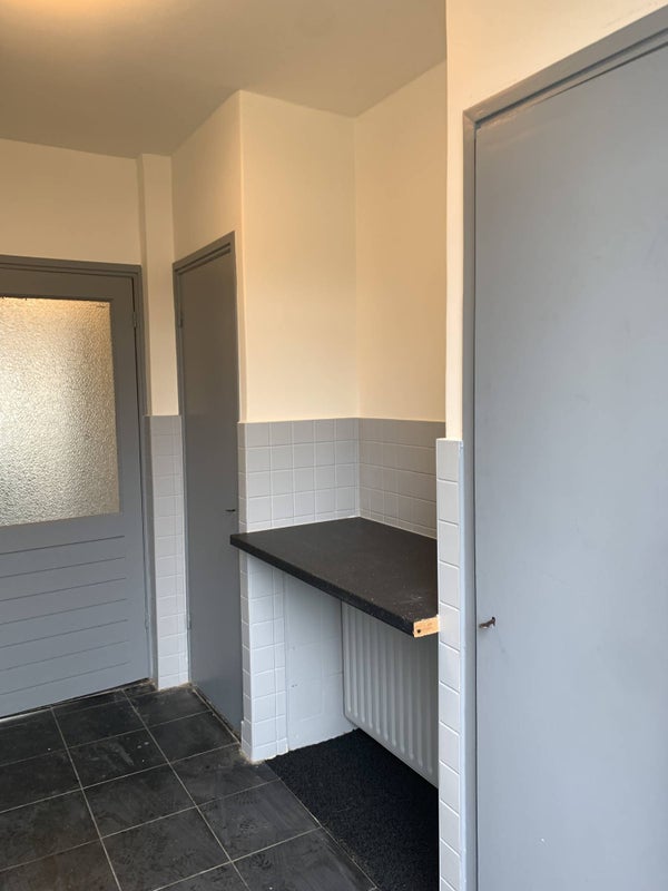Soggiorno con nuovo pavimento in vinile, armadio a muro. Cucina chiusa con pavimento piastrellato. La cucina è dotata di tutti gli elettrodomestici da incasso, due armadi a muro e una porta che dà sul giardino.