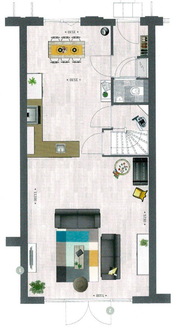 Entrata con accesso all'atrio, seguita dal bagno e dalla scala per il primo piano. Il soggiorno è spazioso con una bella cucina aperta dotata di vari elettrodomestici da incasso come un frigorifero, piano cottura a induzione e lavastoviglie.