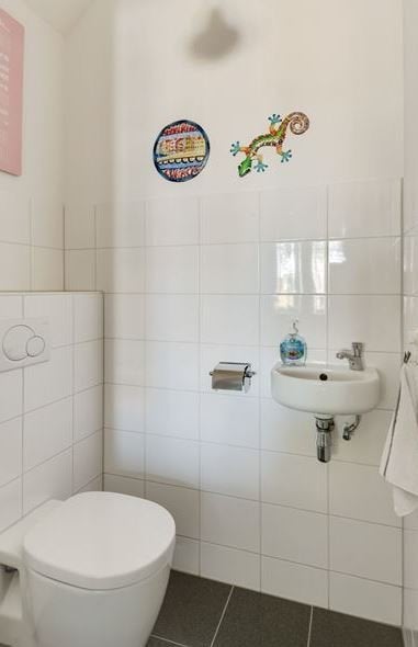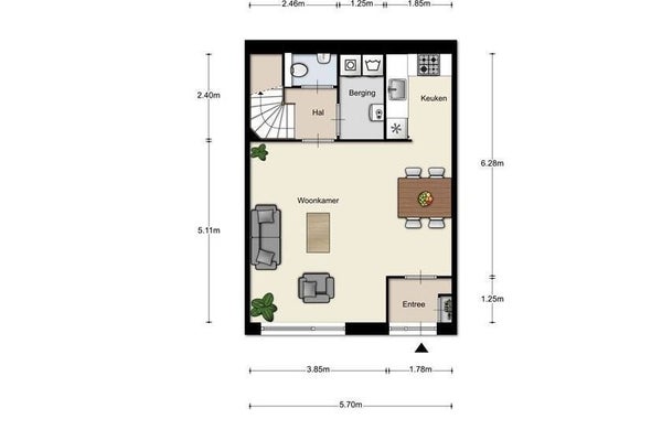 Giardino anteriore ben curato con terrazza che conduce all'ingresso dell'abitazione. Corridoio con contatore e accesso al soggiorno. Il soggiorno (ca. 27 m²) è dotato di un bel pavimento in piastrelle di ardesia. Sul retro si trova una cucina semi-aperta con arredamento bianco lucido fornita di piano cottura a gas, cappa aspirante in acciaio inossidabile, forno a microonde/combinato, lavastoviglie e frigorifero. Portico con scala e accesso al bagno e ripostiglio interno. Toilette moderna, parzialmente piastrellata, con wc sospeso e lavabo. Ripostiglio interno con installazione della caldaia combinata, allacciamento per la lavatrice e unità di ventilazione meccanica.