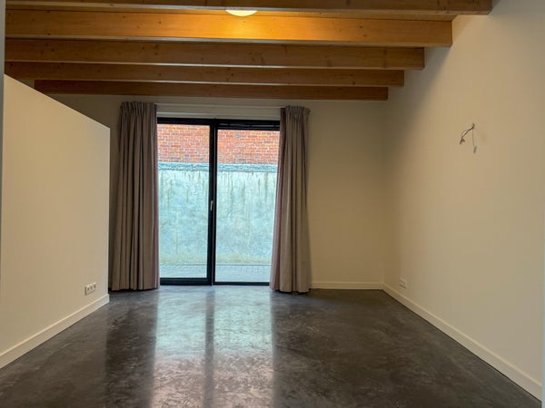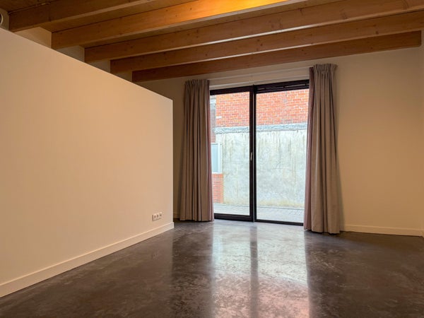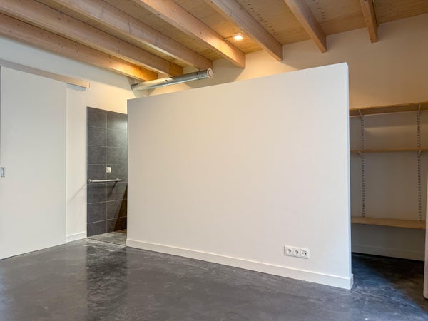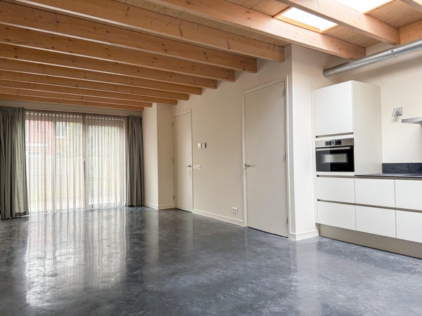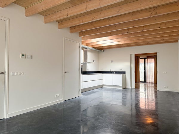 Ingress, corridoio con bagno, soggiorno con cucina aperta. Il soggiorno è dotato di un pavimento in cemento scuro. La cucina è attrezzata con elettrodomestici da incasso: un forno combinato, lavastoviglie, piano cottura e cappa. Locale tecnico con attacco per la lavatrice.