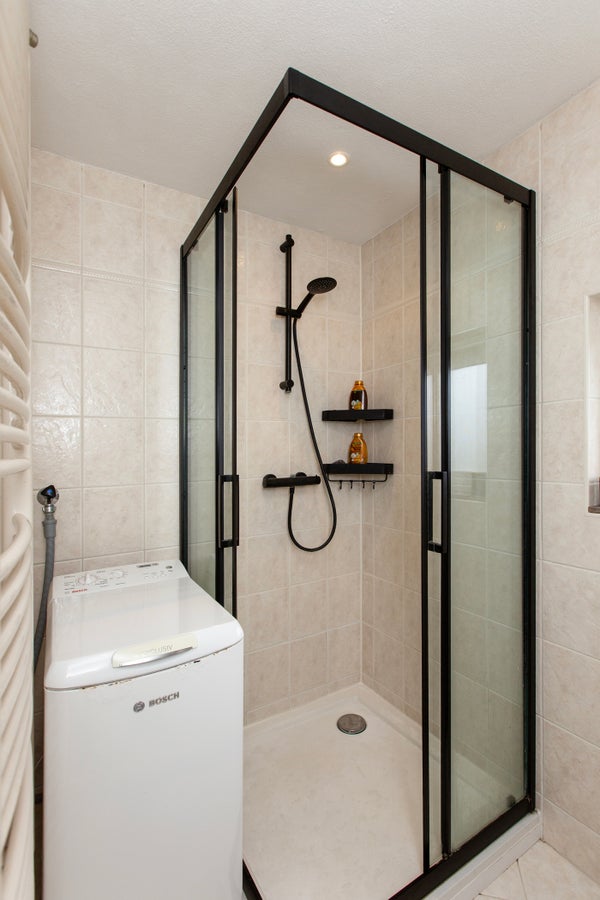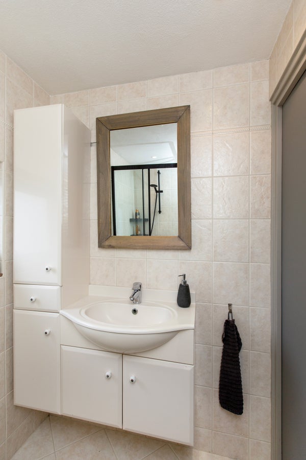 Il bagno è dotato di una doccia a filo e di mobili da bagno. Qui è presente anche una lavatrice.