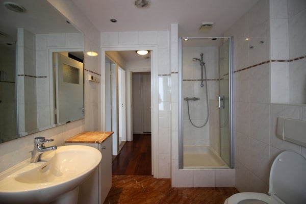 Qui si trova anche un ampio bagno con lavabo, doccia e wc.