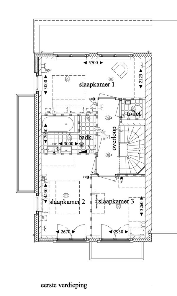 Piano di atterraggio con bagno separato. 1a camera da letto (padronale) sul retro. 2a e 3a camera da letto nella parte anteriore. Bagno moderno con vasca, cabina doccia e grande lavabo doppio con mobile e specchio con illuminazione.