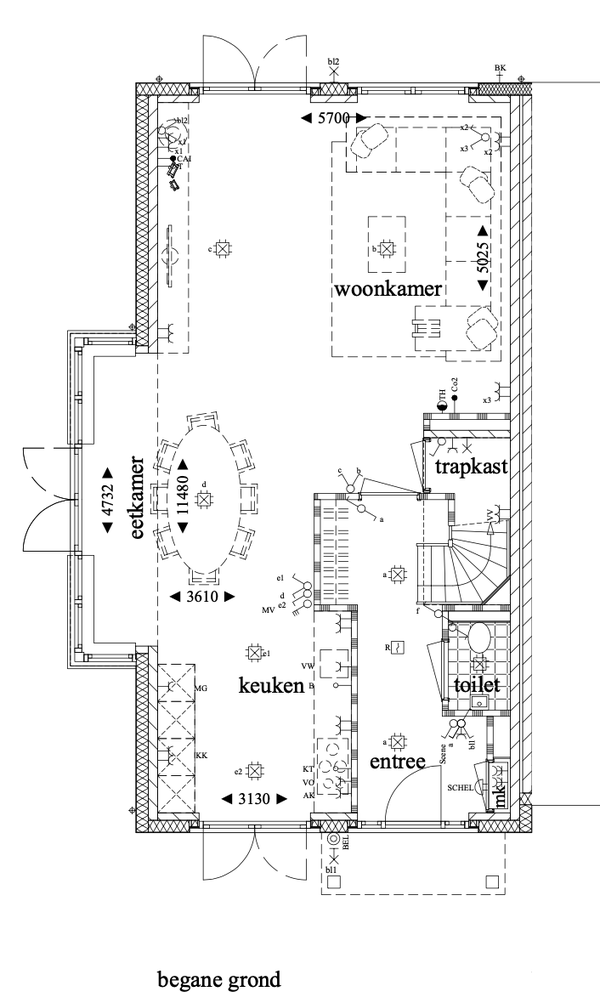 Ingresso, corridoio con quadro elettrico, porta per la cantina e bagno con lavandino. Ampio soggiorno con ripostiglio sottoscala e 2 porte-finestre che si aprono sul giardino. Cucina aperta nella parte anteriore con una bella configurazione della cucina e vari elettrodomestici incorporati, ovvero: piano cottura a induzione a 5 fuochi, cappa in acciaio inossidabile, frigorifero con congelatore, lavastoviglie e forno.