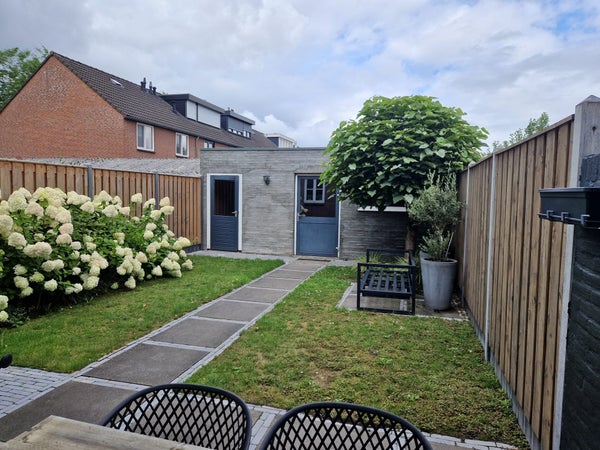 Sul retro della casa c'è un meraviglioso e spazioso giardino che offre privacy. È dotato di eleganti pavimentazioni decorative ed è parzialmente coperto d'erba con piante perenni e un grande albero. Oltre al tavolo che può ospitare 4 persone e un divano lounge per 2 persone, alla fine del giardino c'è un ampio capanno per riporre biciclette, strumenti, cuscini da giardino e altro ancora.