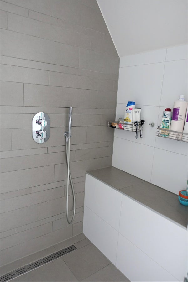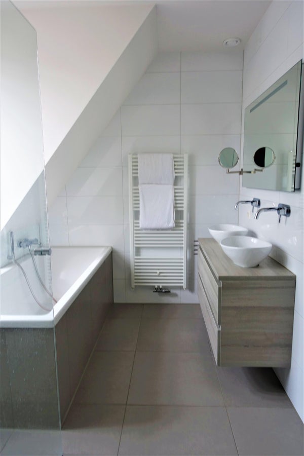 Bagno di lusso con doccia doppia di lusso, vasca da bagno e doppio lavabo. Servizi igienici separati. Lavanderia o locale tecnico dotato di caldaia, impianto di recupero del calore e attacchi per lavatrice e asciugatrice.