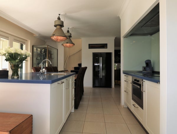 - Una cucina a vista con isola, piano cottura e forno elettrico, grande credenza e frigorifero/freezer americano e tavolo da pranzo per 6 persone. In questo grande spazio aperto si trova la scala che porta al piano superiore.