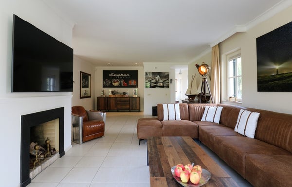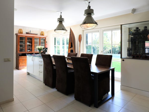 - Nella zona soggiorno con ampio divano ad angolo non solo avete una vista sulla grande televisione e sul camino, ma grazie alle numerose porte finestre anche sulla generosa giardino.