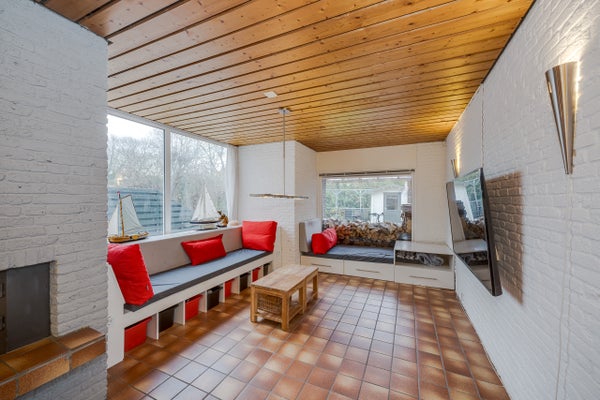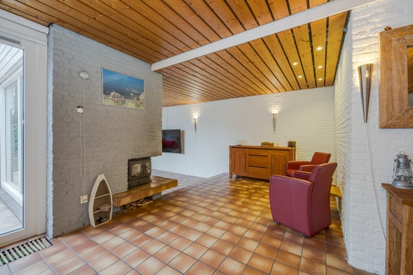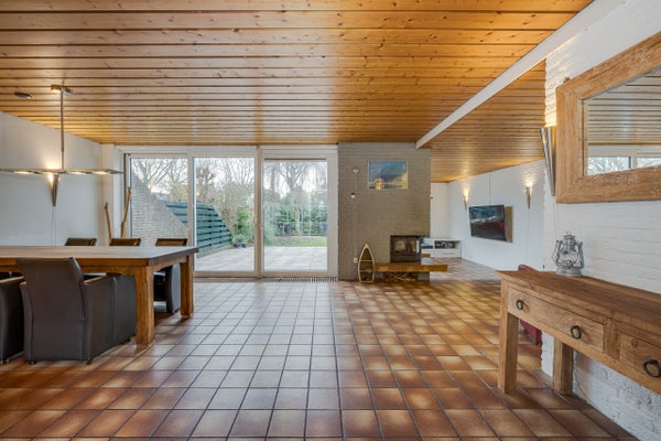 Il soggiorno spazioso dispone di una cucina aperta nella parte anteriore, un'accogliente zona pranzo e una zona soggiorno con camino e bella vista sul giardino sul retro. Sia una porta scorrevole che una porta normale forniscono accesso al giardino sul retro.