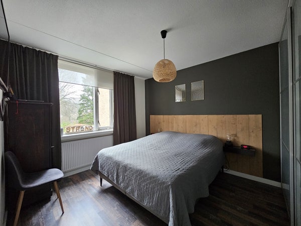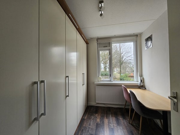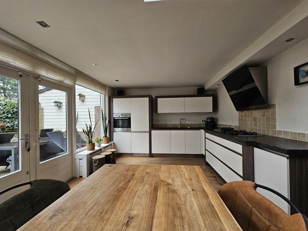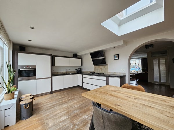 Ampio soggiorno con cucina a vista sul retro della stanza con molta luce naturale grazie alle grandi finestre. Puoi accedere al giardino dalla cucina. Meraviglioso per l'estate! La cucina è dotata di tutti gli elettrodomestici necessari come forno, frigorifero, congelatore, lavastoviglie e piano cottura con cappa. C'è anche abbastanza spazio di archiviazione nei numerosi armadi della cucina.