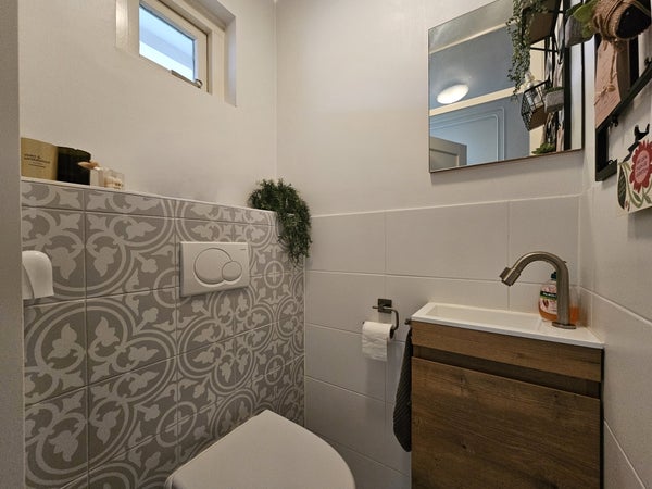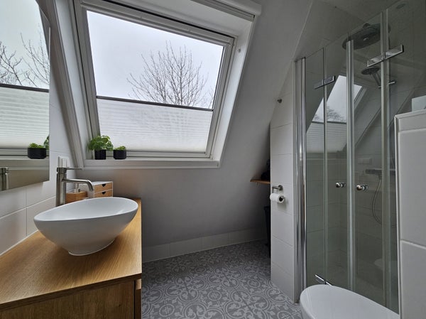 Al primo piano hai accesso a tre camere da letto spaziose. Il bagno si trova anche al primo piano. Il bagno è dotato di doccia walk-in, WC e un bel lavabo con specchio.