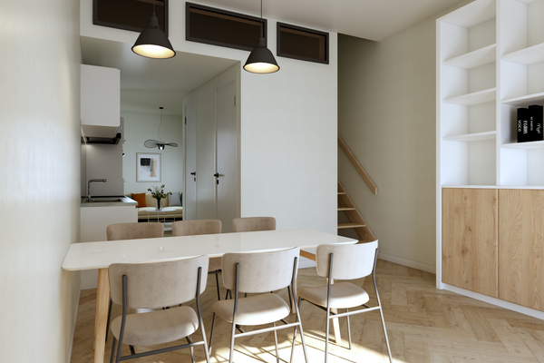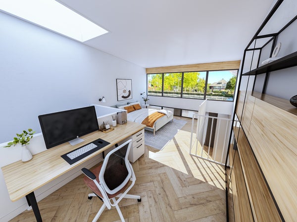 "Edificio Q," un ex edificio militare a Schalkhaar, ospita ora 12 appartamenti in affitto di lusso concepiti per nuclei familiari di 1 o 2 persone. Questi appartamenti senza gas, con etichetta A+++, enfatizzano la sostenibilità e offrono molta luce e spazio. Ogni unità garantisce comfort con un giardino esposto a est e un parcheggio. Presentano finiture di alta qualità, tra cui una cucina di lusso con elettrodomestici Siemens e elementi sanitari moderni. Alcune caratteristiche uniche includono il riscaldamento a pavimento, una doccia a pioggia e opzioni di raffreddamento. La disposizione flessibile consente diversi stili abitativi. Sono disponibili strutture centrali per auto elettriche e il prezzo dell'affitto è di 1.150 € al mese, oltre alle spese di servizio. È in vigore un divieto di fumo e si richiede un reddito minimo di 40.000 € all'anno. La casa copre 63 m² con 1 camera da letto e 2 stanze totali.