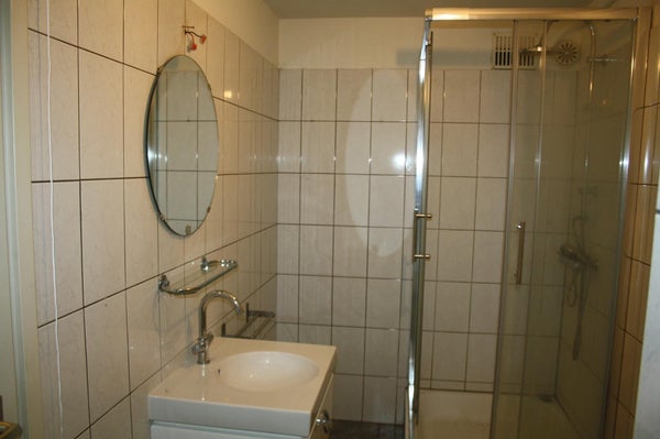 Bagno completamente piastrellato (1.66 x 2.60) con armadio, doccia con cabina doccia e lavabo.