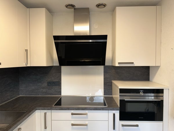 La cucina semi-aperta è dotata di una lussuosa e nuova disposizione della cucina con molto spazio di stoccaggio e moderni elettrodomestici integrati, tra cui piano cottura a induzione BORA a 4 fuochi con cappa integrata, frigorifero a incasso con congelatore, forno a microonde combinato incassato e lo stesso pavimento in piastrelle del soggiorno. Dalla cucina, puoi accedere al giardino attraverso la porta sul retro.