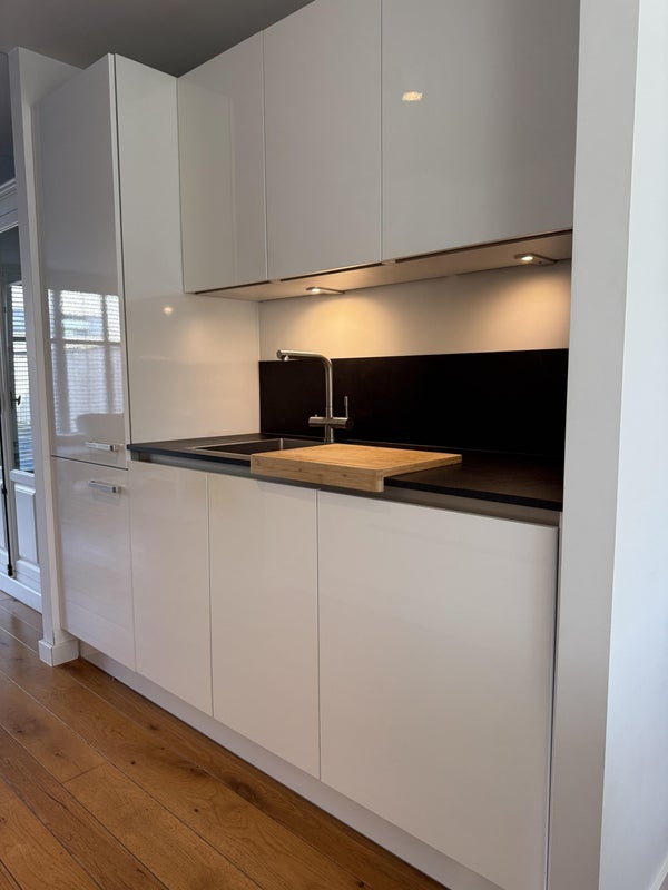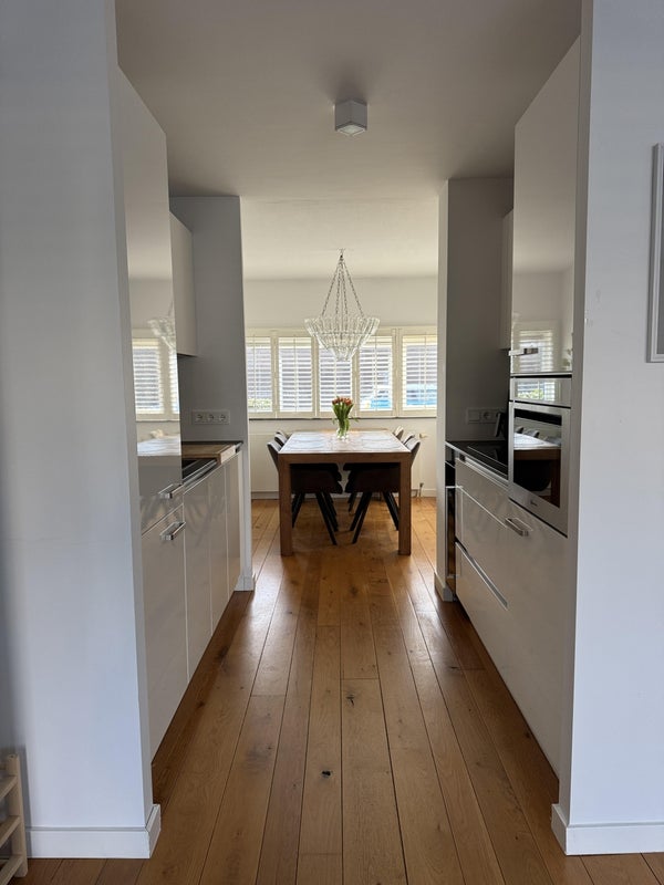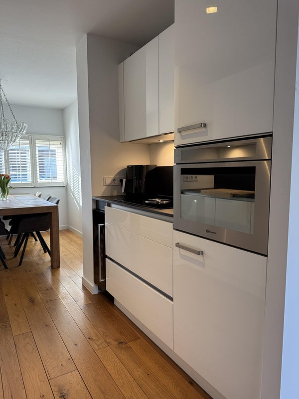Dall'ingresso hai accesso al soggiorno, al bagno, al contatore elettrico e al ripostiglio (provvisto di scaffali). La cucina moderna si trova nella parte anteriore ed è dotata di tutti i comfort: combinazione frigo/freezer, forno combinato, lavastoviglie, piano cottura a induzione (Bora) con estrazione e un rubinetto per acqua bollente. Dalla cucina si accede alla accogliente sala da pranzo.