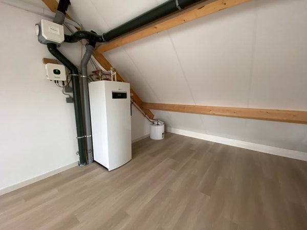 Locale tecnico con alloggiamento per la pompa di calore Nefit (2021), ventilazione bilanciata meccanica e il distributore dei pannelli solari. Qui si trovano anche le connessioni per la lavatrice e l'asciugatrice. L'intero piano è dotato di un pavimento in PVC di rovere naturale.