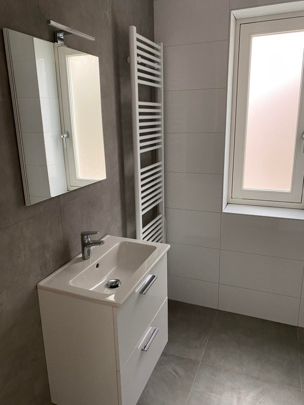 Bagno completamente piastrellato con doccia, mobile lavabo, wc sospeso e radiatore di design elettrico.
