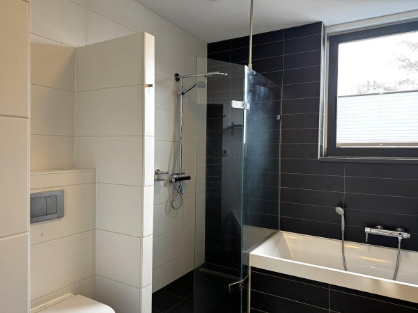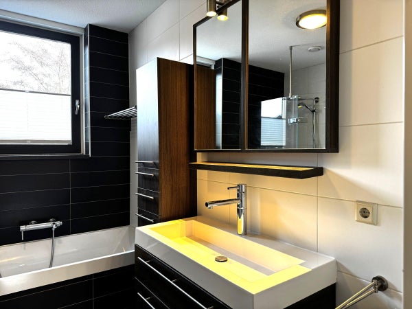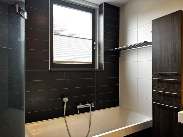 Salendo le scale si accede al pianerottolo con accesso a 2 camere da letto spaziose e al bagno. Il bagno è dotato di vasca, doccia separata, WC, lavabo con mobili e radiatore di design.