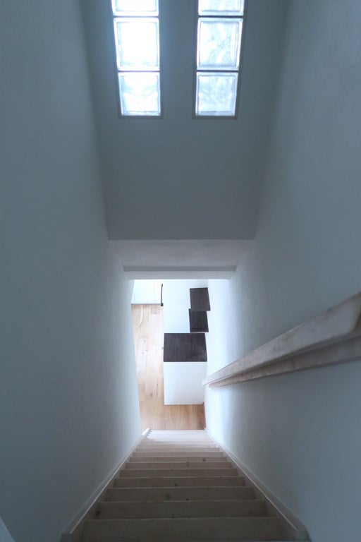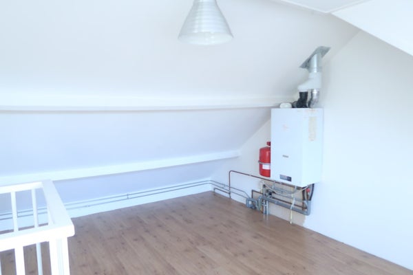 Attraverso le scale si accede a un pianerottolo che dà accesso alla camera principale (4,10 x 2,85m), al bagno e a una camera più piccola (2 x 3,50 m). Nella camera grande c'è una parete armadio con appendiabiti e zona per sdraiarsi, cassetto per calzini, ecc.