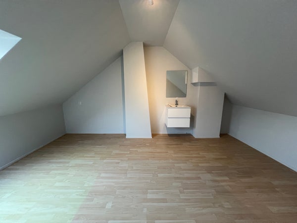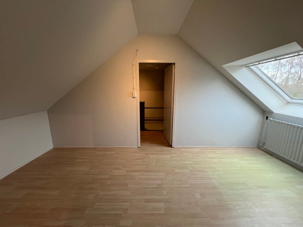 Una scala fissa ti porta all'ultimo piano. Qui arrivi prima in un corridoio con spazio di stoccaggio dietro i pannelli inclinati. La quarta camera da letto ha una grande finestra sul tetto che lascia entrare molta luce naturale ed è dotata di un lavandino privato. Questa camera offre abbastanza spazio per un letto matrimoniale e mobili extra.